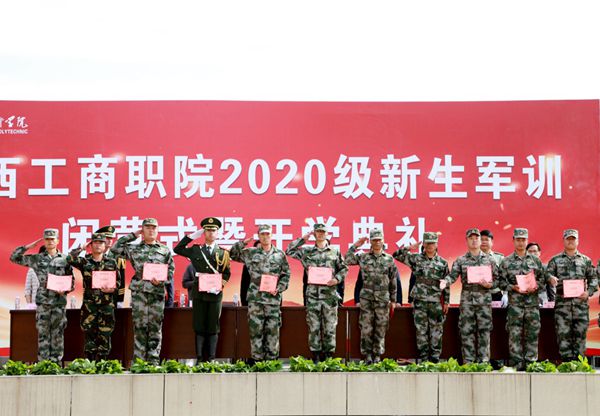 军训会操表演之后,胡志鹏副校长宣读对军训优秀标兵、优秀指导老师、优秀教官、优秀连队的表彰决定,赵顶兴书记向承训单位赠送写有“新生英姿描绘未来工商,教官风采尽展美丽校园”的锦旗。随后,胡鹏飞校长助理总结了2020级新同学军训工作,教官代表、教师代表和新老生代表分别做了精彩的发言。