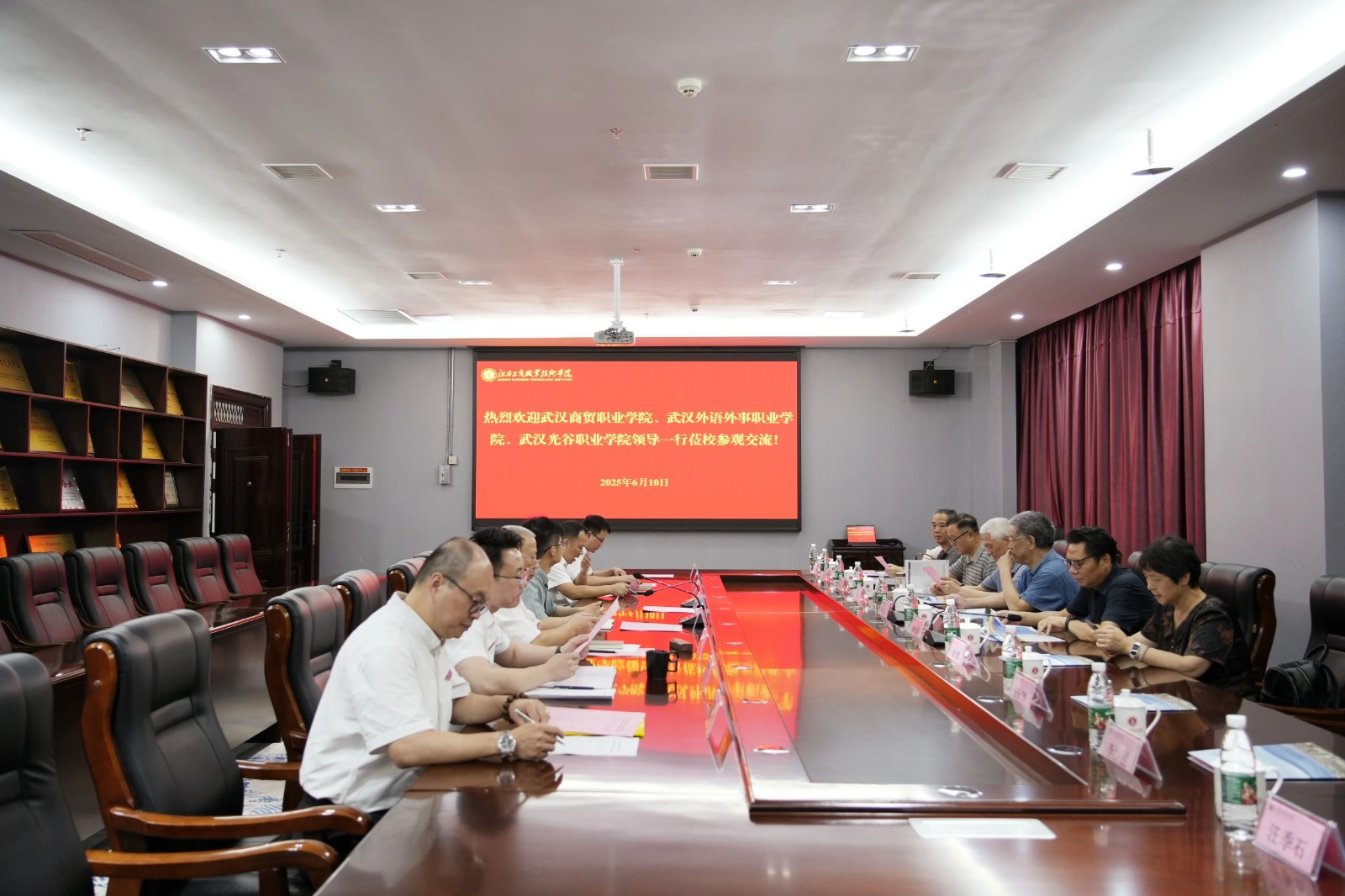 6月10日下午,武汉商贸职业学院校长马必学、武汉外语外事职业学院校长熊仕涛、武汉光谷职业学院党委书记饶水林等一行10人来我校开展交流学习,共探职业教育高质量发展新路径。学校在图书馆五楼第一会议室召开座谈,校党委委员、行政负责人李盛艳,党委副书记吴鹏程等在家校领导出席。