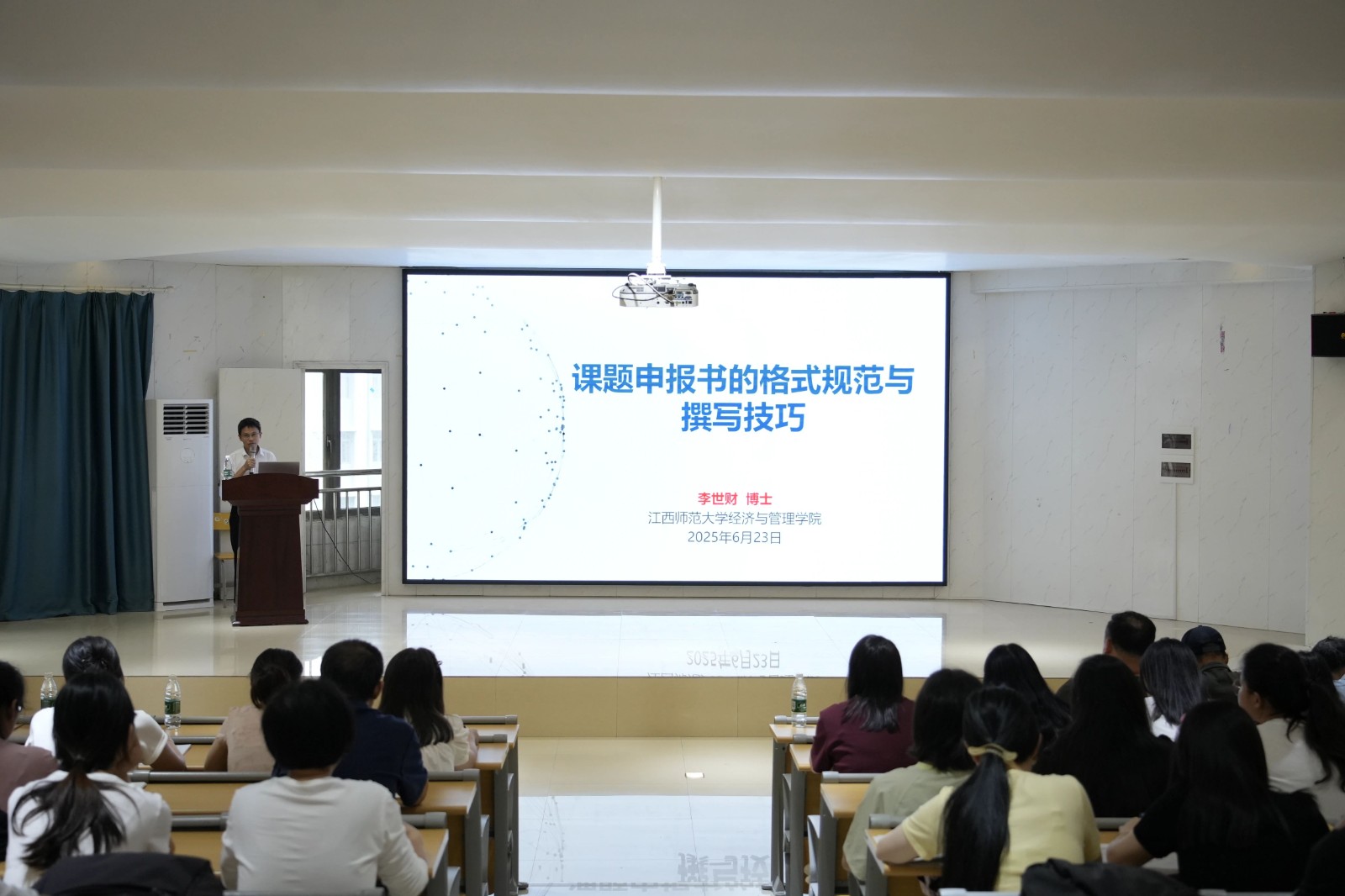 6月23日上午,“先锋领航 聚仁智汇”大讲堂第四讲在数智经济学院报告厅成功举办。讲座以“课题申报书的格式规范与撰写技巧”为主题,由江西师范大学经济学博士、硕士生导师李世财副教授主讲。中层干部、各二级学院教师代表共计200余人聆听讲座。