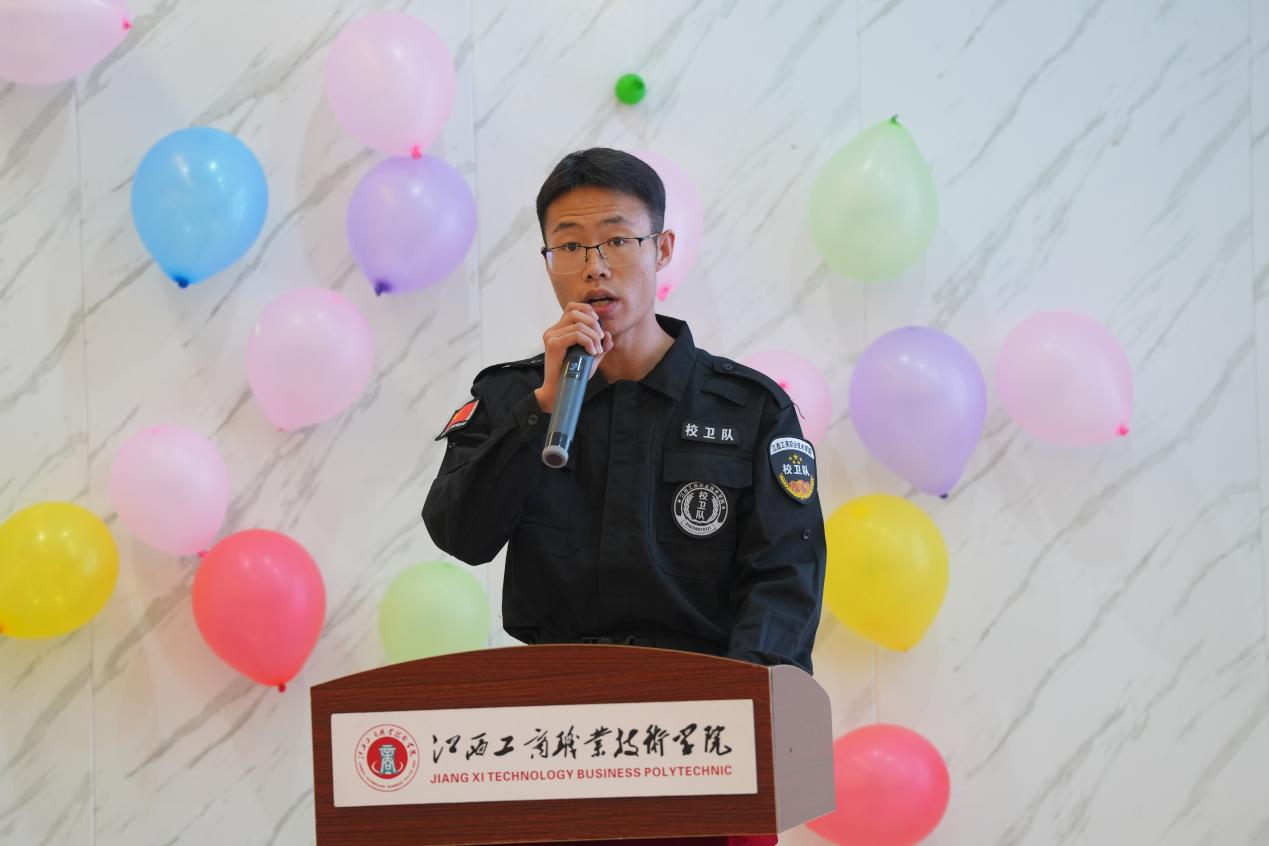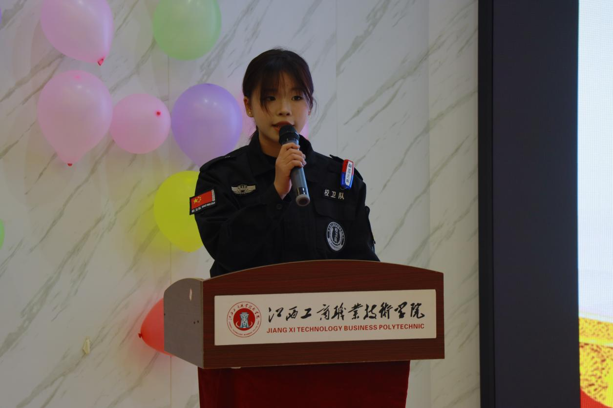2023级校卫队队长廖豪峰代表全体老队员回顾了一年来的活动开展情况与成绩,对新入队队员提出希望。2023级优秀中队长魏馨妍、杨添淇代表作了获奖感言,同时也向新入队的队员表示祝贺;同时24级校卫队队长李善义对新一届校卫队作了全面规划,号召全体新队员向老队员学,学习他们纪律严明,工作有热情,处处树形象,事事有回音,队员有团队合作精神,接好校卫队永不言退、责任所在的接力棒,为学校安全稳定再创佳绩。
