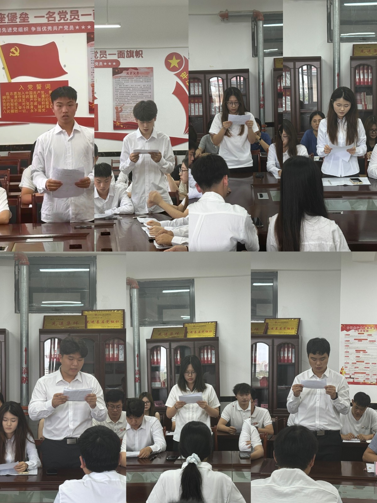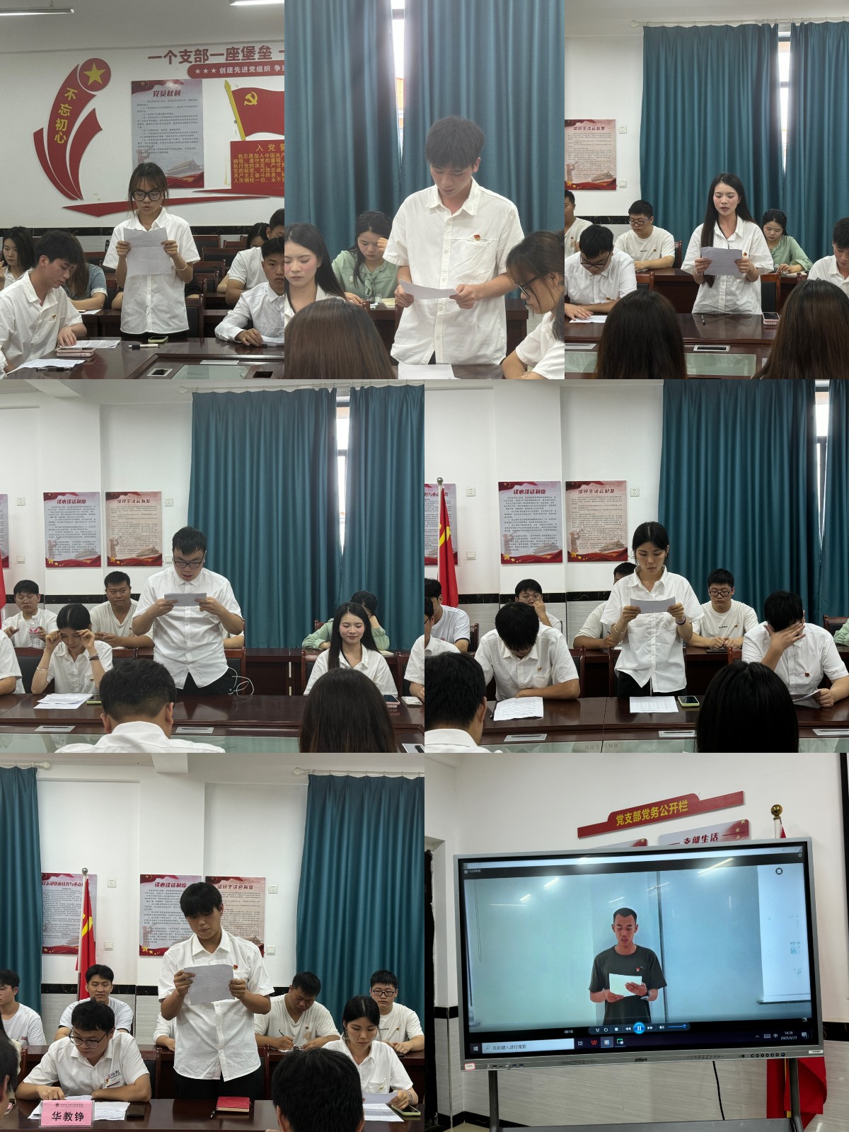 会议就朱子豪、左金涛、李明桦、陈将豪、李胚玲、黄雪、程梦楠7名同志由发展对象接收为预备党员事宜进行了讨论和表决。7名发展对象向大会汇报了个人学习、思想、工作等方面的情况,表达了对党的认识和入党动机以及自身存在的不足与改进方向。入党介绍人分别介绍了发展对象在培养考察期间的表现,肯定其思想进步、工作积极,认为已基本具备党员条件。支委会详细报告了发展对象的政治审查、公示等情况,确认其符合党员发展要求。与会党员充分发表意见,最终经有表决权的正式党员采取无记名投票方式表决,一致同意朱子豪、左金涛、李明桦、陈将豪、李胚玲、黄雪、程梦楠7名同志接收为中共预备党员。入党介绍人为新接收预备党员佩戴党徽。