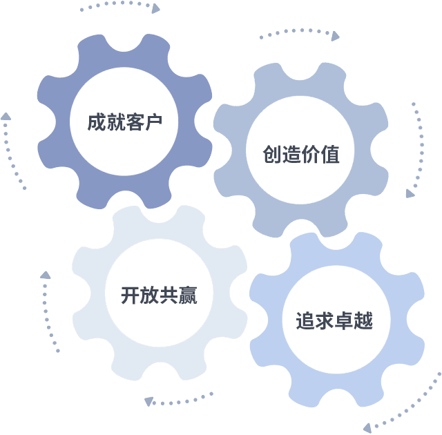 成就客户是一切决策的出发点,,,,创造价值是衡量所有工作的标准,,追求卓越是银钻国际做事做人的态度,,,开放共赢是银钻国际的格局也是最终的结果。。。。价值观的齿轮环环相扣,,推动着组织里的每个人不断向前。。